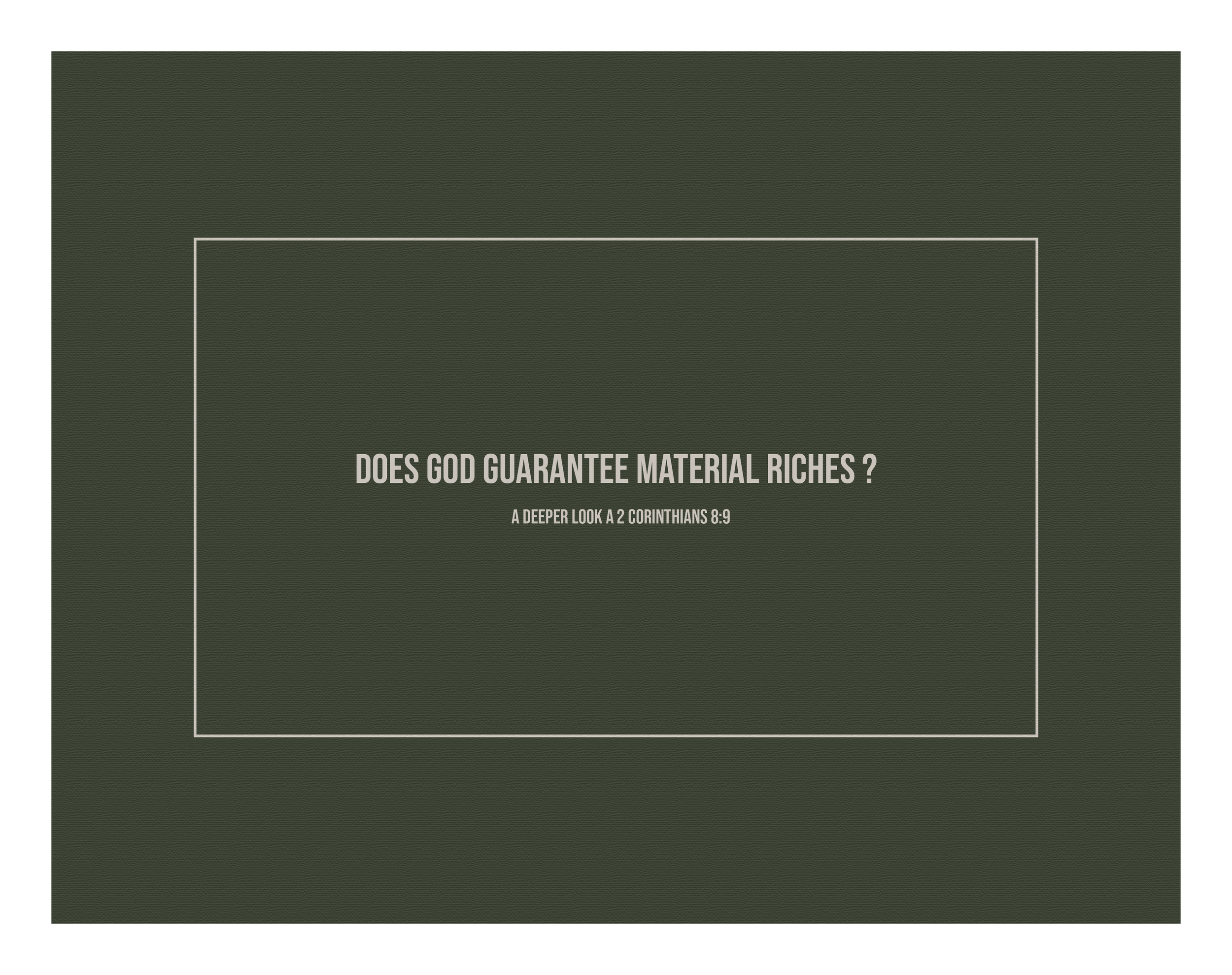 There is a popular belief in many churches today that God wants His followers to be rich or promises them material wealth. Many are taught that God guarantees material riches, often using Bible verses as proof texts. One such verse is 2 Corinthians 8:9, which states: “For you know the grace of our Lord Jesus Christ, that though he was rich, yet for your sake he became poor, so that you through his poverty might become rich."